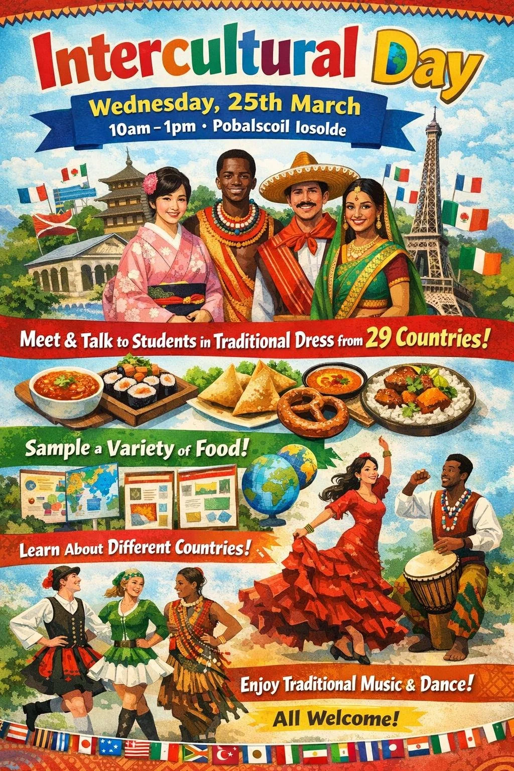 Parents / Guardians, you are invited to our Intercultural Day on Wednesday, 25 March from 10am to 1pm in the Sports Hall at Pobalscoil Iosolde.