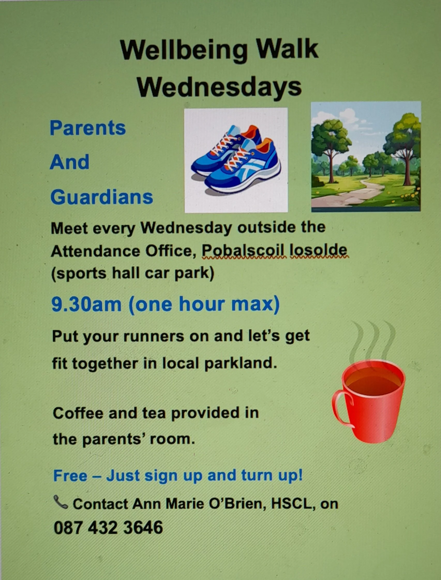 📞 Contact Ann Marie O’Brien, HSCL Coordinator, on 087 432 3646 to sign up.